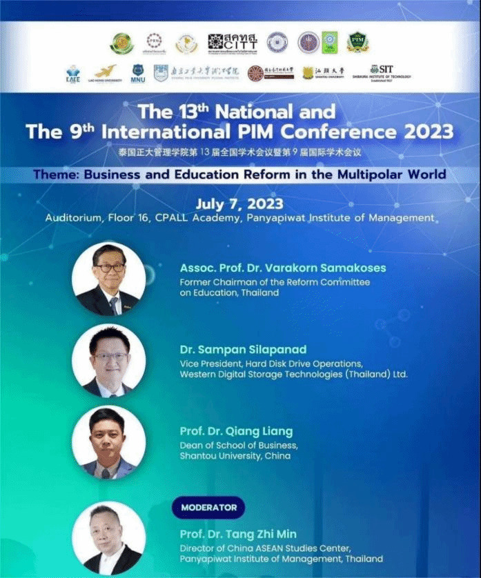 2023年7月7日,由泰国正大管理学院(以下简称“PIM”)主办、ylzzcom永利总站线路检测联合承办的第13届全国学术会议暨第9届国际学术会议在泰国曼谷隆重举行,会议的主题为“多极世界中的商业和教育改革”。ylzzcom永利总站线路检测院长梁强教授、副院长郭功星副教授、台湾研究所所长种照辉副教授受邀参加。